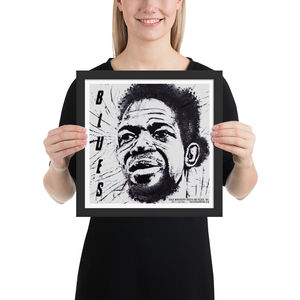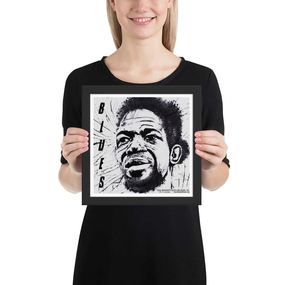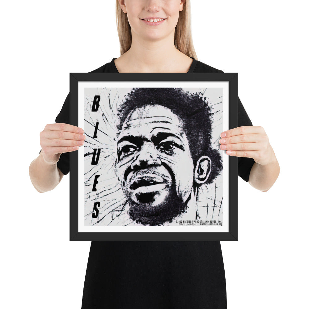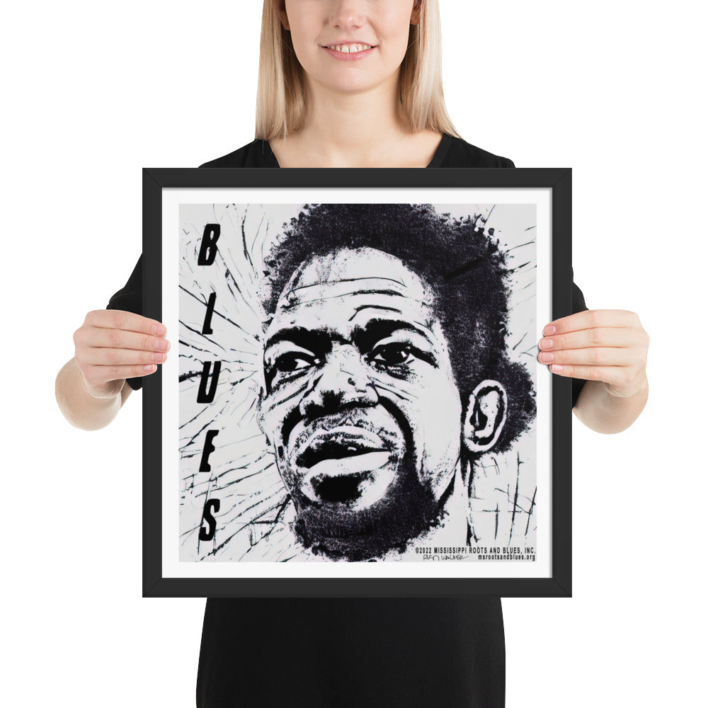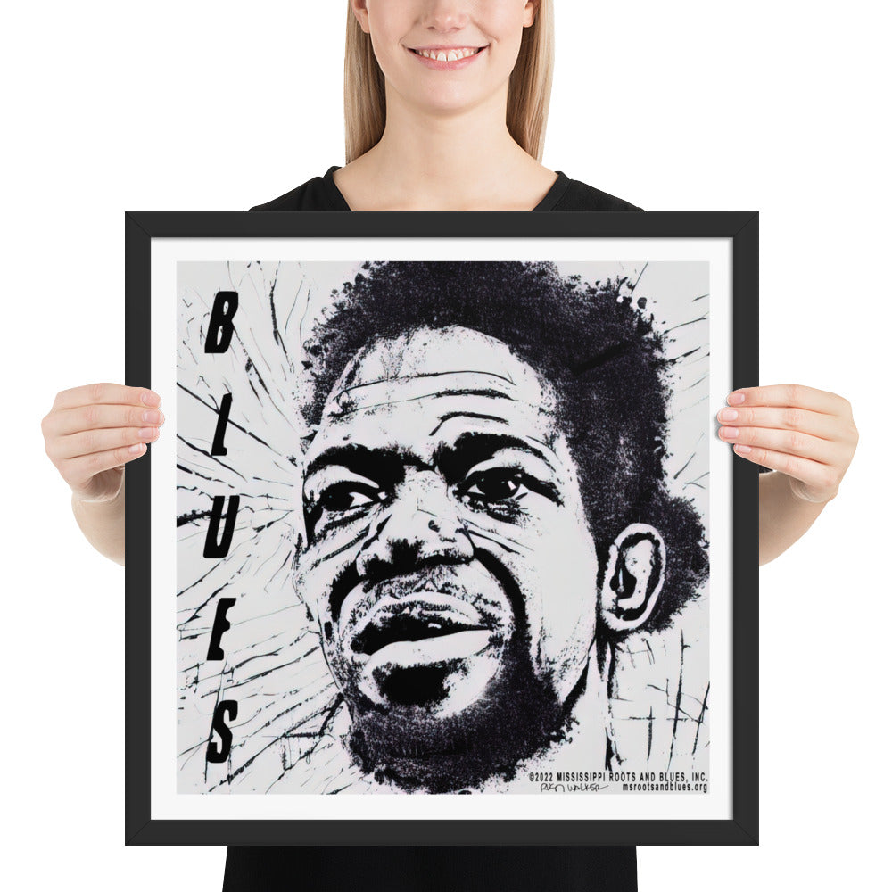 Introducing our limited edition Blues art poster! This dynamic portrait of a blues artist, with the word BLUES down the side, is sure to add some coolness and style to any space. Printed on high-quality paper with a partly glossy, partly matte finish, this framed poster is a must-have for any music lover.