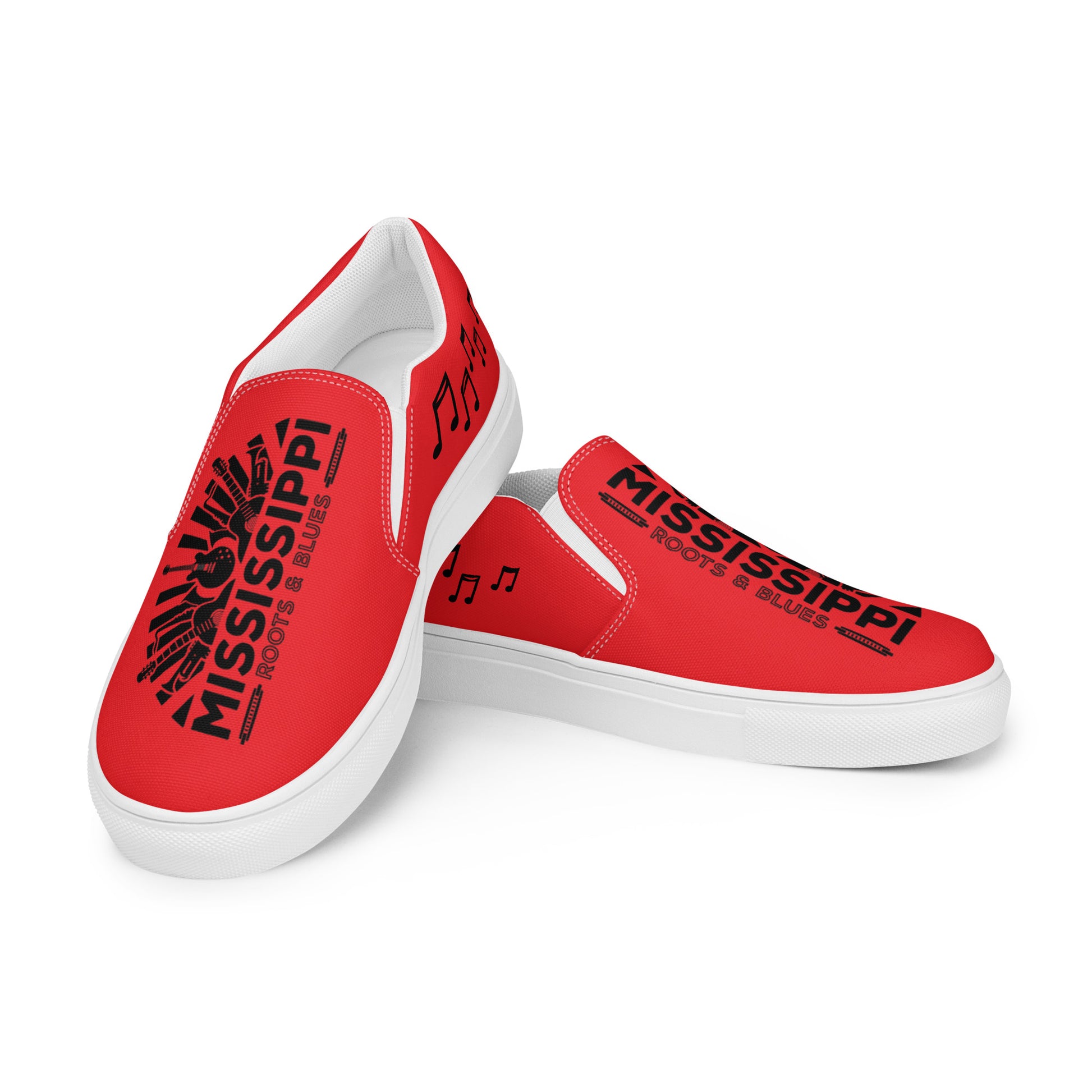 Turn heads with our Men's Custom MS Blues Logo Red Slip-On Canvas Shoes. Perfect for music enthusiasts and trendsetters alike, these vibrant red shoes are a symphony of style, comfort, and a deep love for blues music.